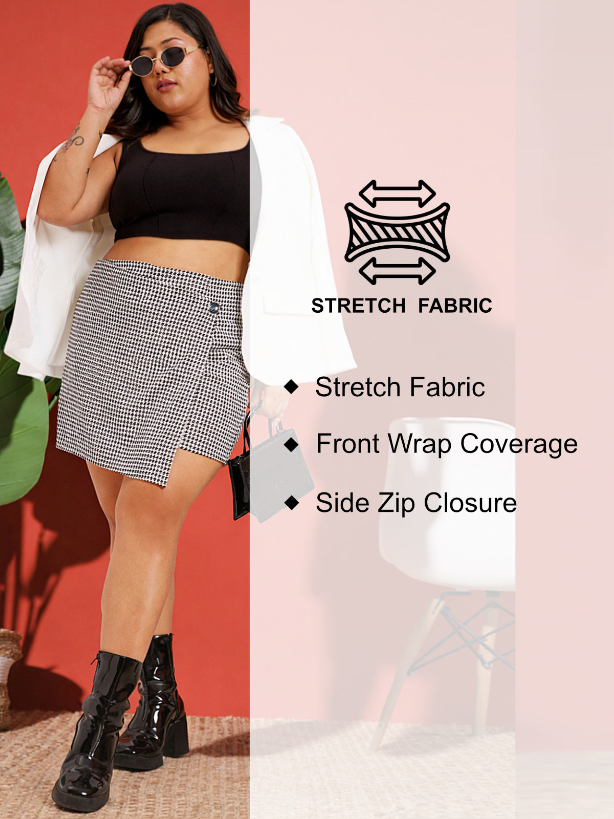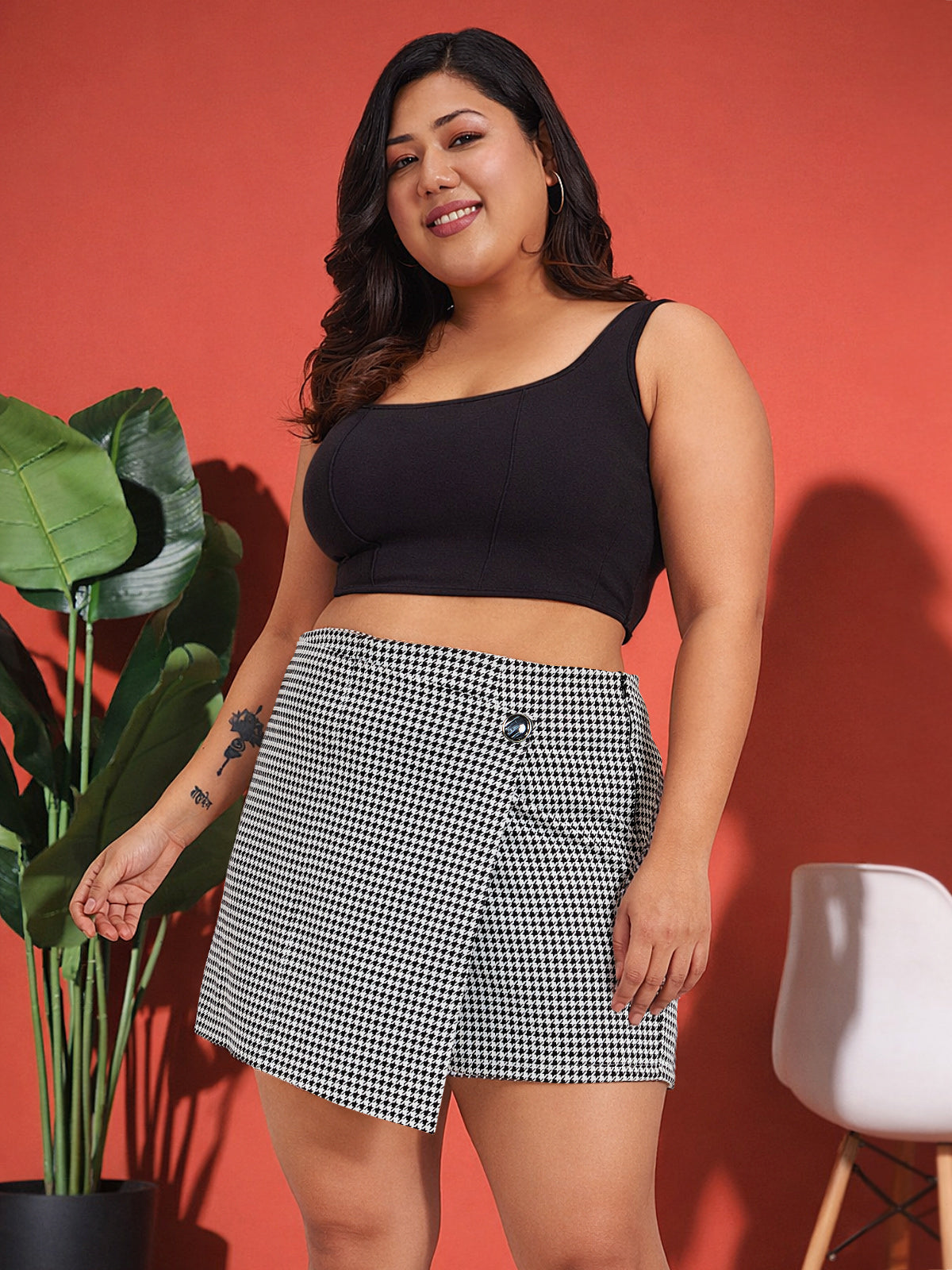 This classic black white houndstooth mini skort for plus size women blends chic style with comfort, featuring a front flap with button detail and zip closure. Crafted from stretchable viscose fabric for curvy women, it ensures ease and durability with machine wash.