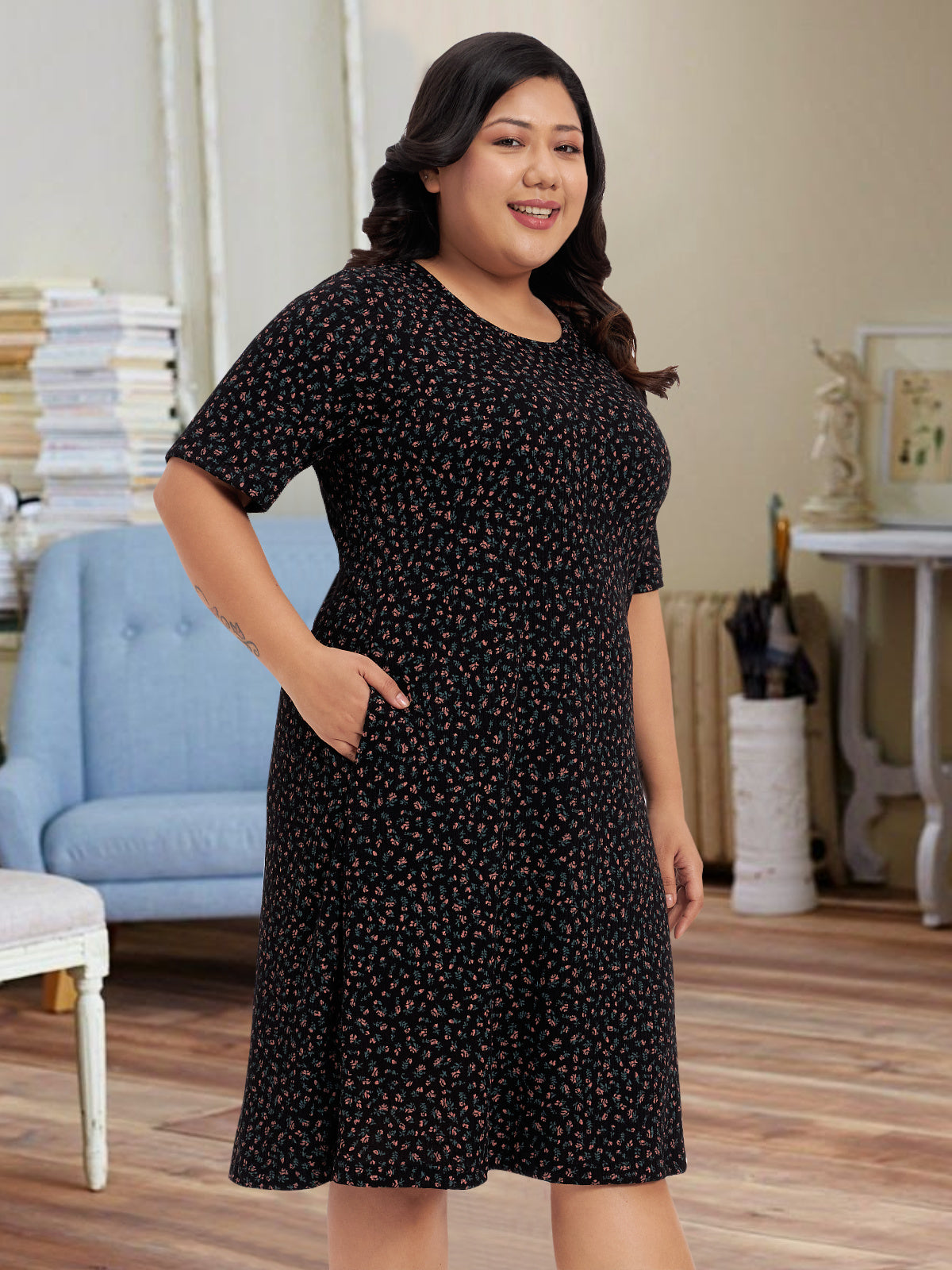 This Black plus-size floral print cotton nighty offers breathable comfort with stretchable knit fabric. Features a slip-on design, side pocket, round neck, and curved hem. Perfect for curvy women seeking relaxed fit for all night sleep