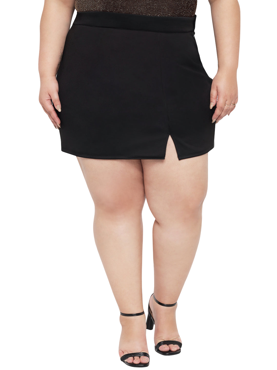 Black stretch mini skirt styled with front slit, this short skirt back waist is elasticised for better grip & side zip for easy wear