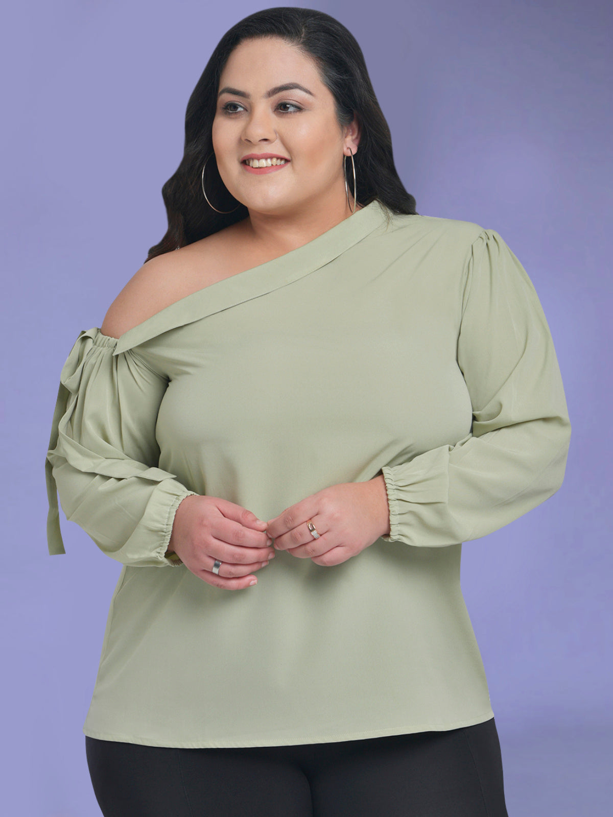 Mint green regular fit crepe top is styled with asymmetric collar that dips one shoulder to full puff sleeves with elasticated hem. Comes with elasticated shoulder and tie up bow for a better fit